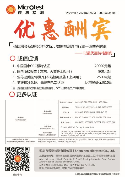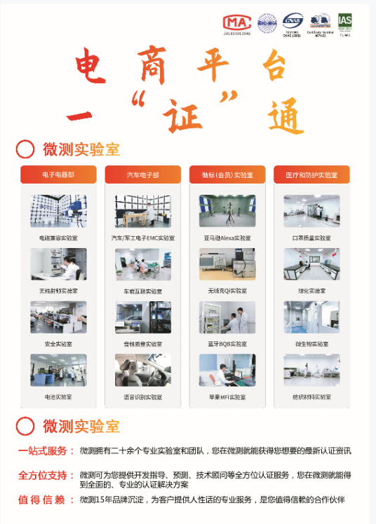 Microtest是國家CNAS、中國計量認證CMA、美國實驗室認可協(xié)會A2LA、無線充電聯(lián)盟WPC、藍牙認證評估委員會SIG、亞馬遜Amazon等國際機構的認可實驗室。Microtest的使命:讓您的產品通全球!