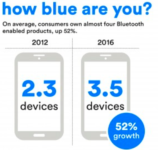 藍(lán)牙品牌認(rèn)知度日益提升,人們對(duì)這項(xiàng)技術(shù)及其應(yīng)用的了解相較于四年前也有所提高。這也是諸多工程師廣泛在其設(shè)備中整合低功耗藍(lán)牙特性的必然結(jié)果。以英國(guó)為例,平均每位消費(fèi)者擁有3.5臺(tái)藍(lán)牙設(shè)備,而這一數(shù)字在2012年是2.3,足以說(shuō)明消費(fèi)者也開(kāi)始意識(shí)到,越來(lái)越多的設(shè)備開(kāi)始采用藍(lán)牙技術(shù)了。