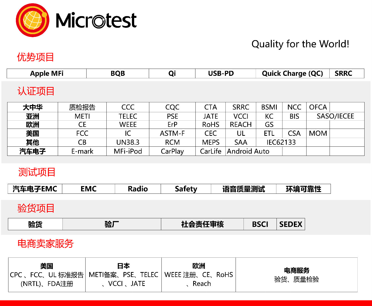 Microtest是國家CNAS、中國計量認證CMA、美國實驗室認可協(xié)會A2LA、無線充電聯(lián)盟WPC、藍牙認證評估委員會SIG、亞馬遜Amazon等國際機構(gòu)的認可實驗室。Microtest的使命:讓您的產(chǎn)品通全球!