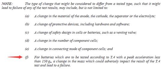 該條款標(biāo)明了:電池經(jīng)過(guò)T4加速度沖擊因質(zhì)量的改變而導(dǎo)致T4測(cè)試項(xiàng)不合格的電池應(yīng)被認(rèn)為是不同于已測(cè)型號(hào)的電池。