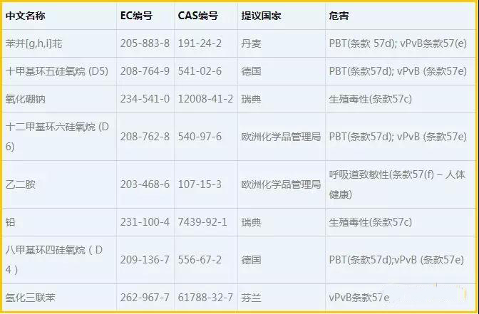 2018年3月9日,歐洲化學(xué)品管理局(ECHA)對(duì)被提議加入REACH法規(guī)高度關(guān)注物質(zhì)(SVHC)清單的八項(xiàng)物質(zhì)開展公眾咨詢,關(guān)于這些物質(zhì)的信息如下表所示: