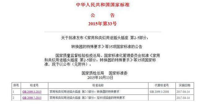 目前插線板行業(yè)俗稱的新國(guó)標(biāo)是指國(guó)家質(zhì)檢總局、國(guó)家標(biāo)準(zhǔn)委2015年10月批準(zhǔn)發(fā)布的GB 2099.3-2015《家用和類(lèi)似用途插頭插座 第2-5部分:轉(zhuǎn)換器的特殊要求》、GB 2099.7-2015《家用和類(lèi)似用途插頭插座 第2-7部分:延長(zhǎng)線插座的特殊要求》