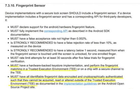 在CDD文件的7.3.10中Google明確要求指紋信息存放在TEE環(huán)境下