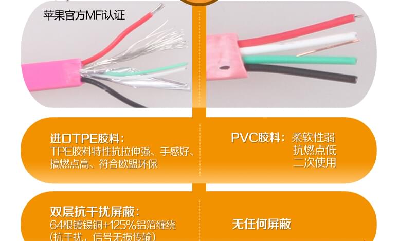 1、認準蘋果MFI認證!蘋果MFi認證,是蘋果公司(AppleInc.)對其授權配件廠商生產外置配件的一種標識使用許可。沒有MFI認證的數據線連接蘋果設備的時候會提示產品不兼容,可能會對產品產生危害。但是辦理MFI認證的費用高、周期長、通過率低,因此市場上充斥這各種冒牌的MFI認證數據線,這類數據線對蘋果設備的危害性是無窮的。購買時認準通過了MFI認證的大品牌。