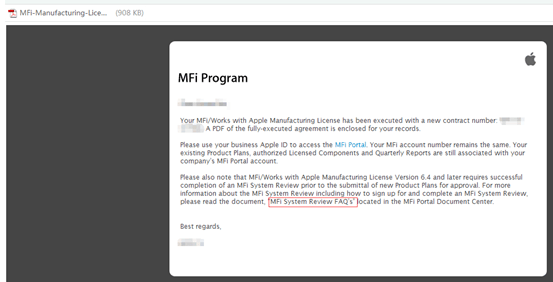 您好,蘋果公司7月21號新規(guī):只有簽署MFi制造許可6.4版本或更新版本的協(xié)議才可以請求MFi體系審核。