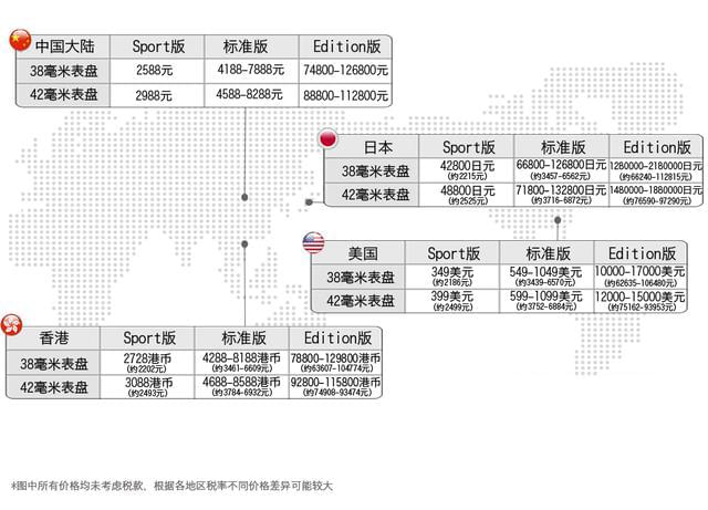 至于大家最關(guān)心的價格方面,這里為大家梳理出了大家最為關(guān)心的中國大陸、中國香港、美國以及日本這四個國家和地區(qū)的價格明細對照。綜合來看,中國香港地區(qū)的發(fā)售價格依然具有優(yōu)勢。(注:所有價格均為蘋果官網(wǎng)顯示的價格,其中美國、日本Apple Watch的價格為稅前價格。)