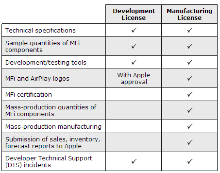 MFI認證有兩種類型:一個是研發(fā)許可一個是生產(chǎn)許可。如果企業(yè)只計劃去研發(fā)產(chǎn)品或者幫組別人研發(fā)產(chǎn)品而不是生產(chǎn)制造,企業(yè)可以申請MFI研發(fā)許可;如果企業(yè)計劃生產(chǎn)MFI相關(guān)配件并且擁有自己的工廠,企業(yè)可以申請MFI生產(chǎn)許可。下面是兩個許可的不同特性。
