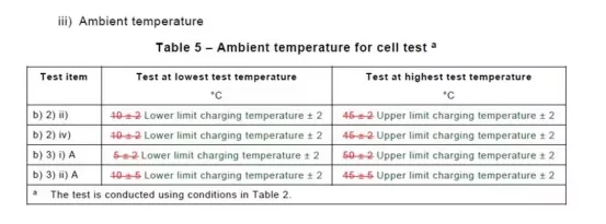 4、7.3.9章節(jié)強(qiáng)制內(nèi)部短路測(cè)試,修正了測(cè)試溫度的描述,由原來的10℃/45℃修改為按照制造商宣稱的充電溫度下限/上限來處理。