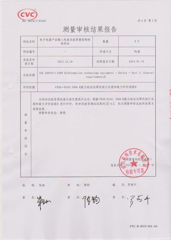 《電子電器產(chǎn)品輸入電流試驗(yàn)質(zhì)量控制標(biāo)準(zhǔn)樣品》測(cè)量審核結(jié)果報(bào)告