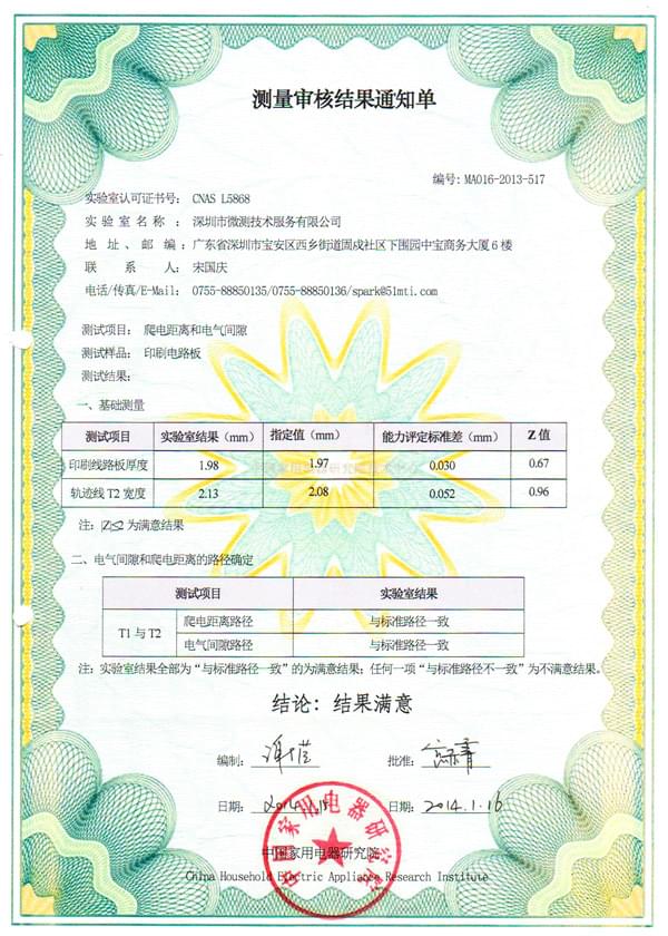 《爬電距離和電氣間隙》測(cè)量審核結(jié)果通知單