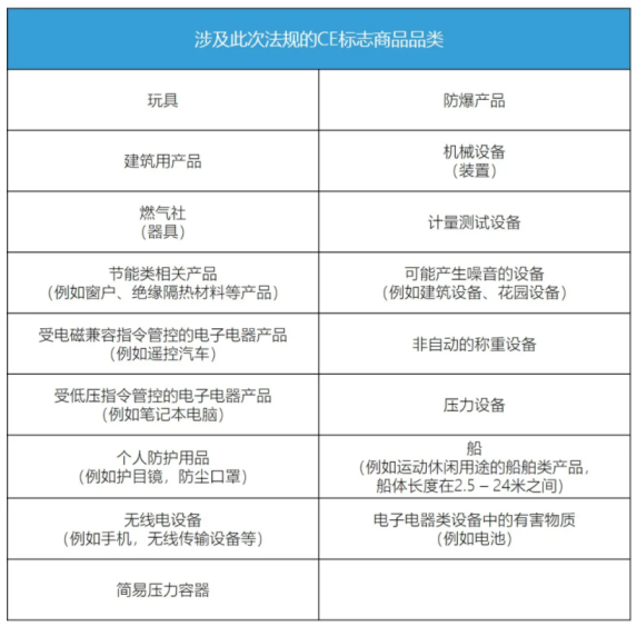不同品類的CE標(biāo)志商品,有不同的指令和法規(guī)對其進行管制。在這里,為大家提供一份此次新規(guī)涉及到的主要商品品類: